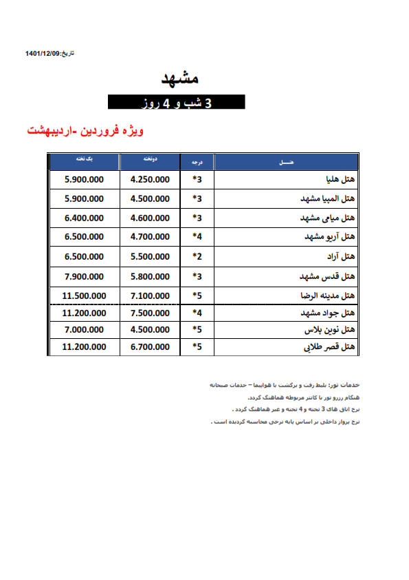 صفحه اصلی تورها تورهای داخلی تور مشهد ویژه پاییز تور مشهد ویژه پاییز مدت اقامت از ۱ روزه پکیج ها شهرهای مورد بازدید مشهد کشورهای مورد بازدید ایران جزئیات تور شهر مبدأ: تهران درباره تور مشهد پاییز