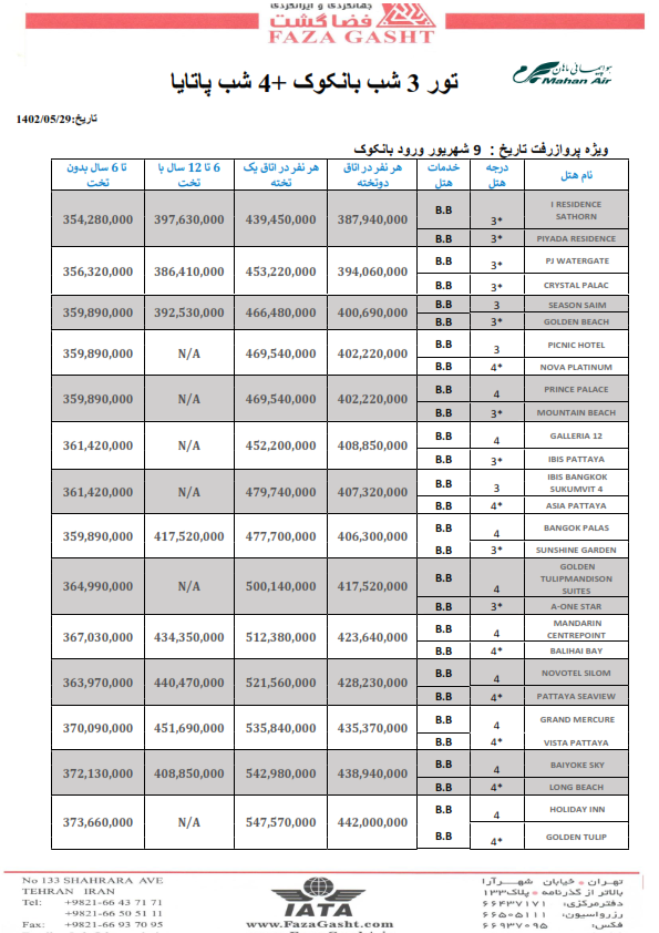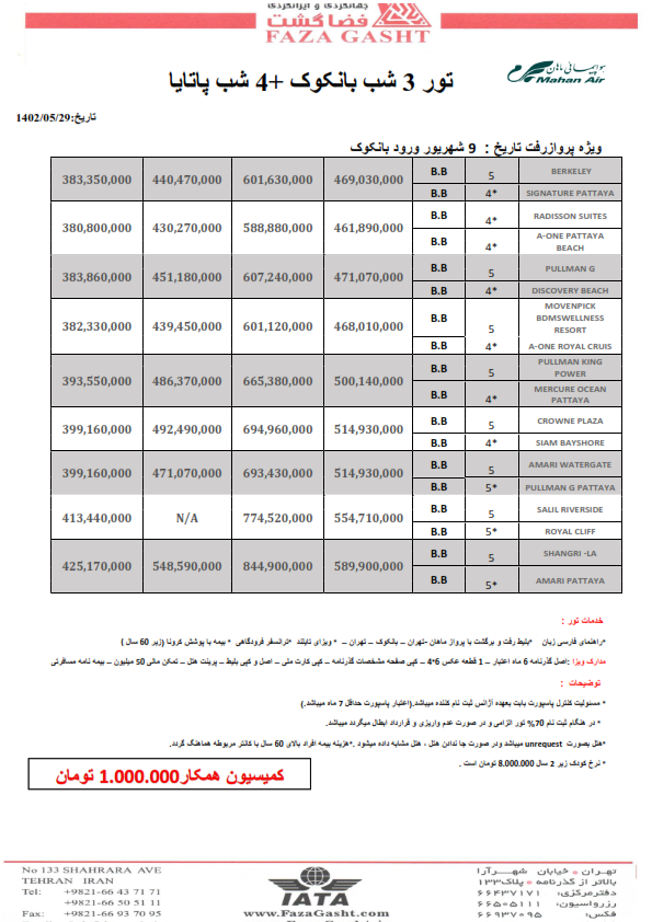 تور 3 شب بانکوک +4 شب پاتایا رفت 9 شهریورپرواز ماهان
